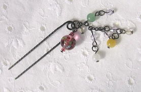 | **試作品 その2** これもミカコ宅ようの花魁プリプ用のとして作ってみた試作品。 左のFIMO薔薇を使用したタイプは私もお気に入り♪ 右のはトンボ玉を使用。もう少しその他のモチーフの工夫をしようと思った作品です。 これはとりあえず、うちの子用となります(笑) |