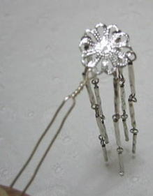 | **試作品 その1** 友人のミカコがプリプのカスタムでテーマを「花魁」にすると言うので、かんざしを作ることにしました。 あれこれ話しをしていると「銀三段びらがあればいいね…」と… 買うとドール用と言えど少々お高いので…(泣) そこで、なんとか作れないものかと… とりあえず座金を使用してメタル竹ビーズでびらを表現 でもなぁ…座金が柔らかいのでこれが出来上がるまでに既に3枚ほど壊してるのね(笑) 改良の余地あり 座金2枚使用で補強して作ってみます |